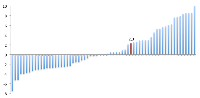 Resultaterne spænder fra -8 til +10 procent fordelt omkring en median på +0,1 procent som oplyst af IFB.