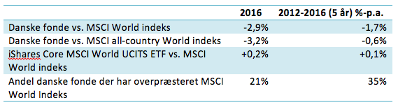 Vi har netop lavet en analyse af danske fonde med globale aktier. Analysen viser, at blot 16 procent der har eksisteret i hele perioden 2012-2016 har slået det globale aktieindeks repræsenteret ved iShares Core World ETF.