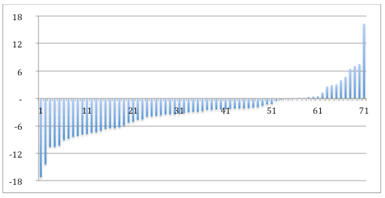 Sagt med andre ord: hvis du skal slå med en terning primo 2012 for at vælge en af de 56 globale fonde, skal du slå en 6’er, hvor 6’eren repræsenterer de fonde, der leverede bedre afkast end iShares ETF’en. I gennemsnit har de 56 fonde underpræsteret med 1,7 procent årligt i perioden og underpræsteret 0,6 procent i forhold til MSCI indekset med alle verdens aktier (inklusive nye markeder).