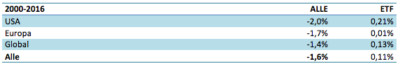 Tabellen nedenfor viser investeringsforeningernes afkast i årene 2000-2016. Tallene viser afvigelsen fra sammenligningsindeks. Som det kan ses, underpræsterer fondene i alle markeder. Tabellen viser også afkastet på udvalgte ETF’er, altså alternativet til de danske aktieforeninger. Bemærk, at ETF’erne leverer et højere afkast målt med samme målestok, som investeringsforeninger sammenlignes med.