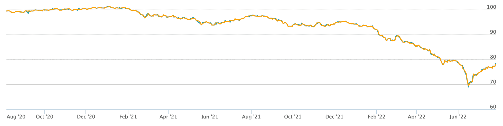 Renterne er steget pænt gennem 2021 og 2022. Men i juli faldt de en del tilbage. Figuren viser, hvordan det afspejles i kursen på en dansk realkreditobligation, der i maj var omkring kurs 80, og som så faldt til under kurs 69 i juni og nu nærmer sig kurs 80 igen. Der er smæk for skillingen på lange obligationer!