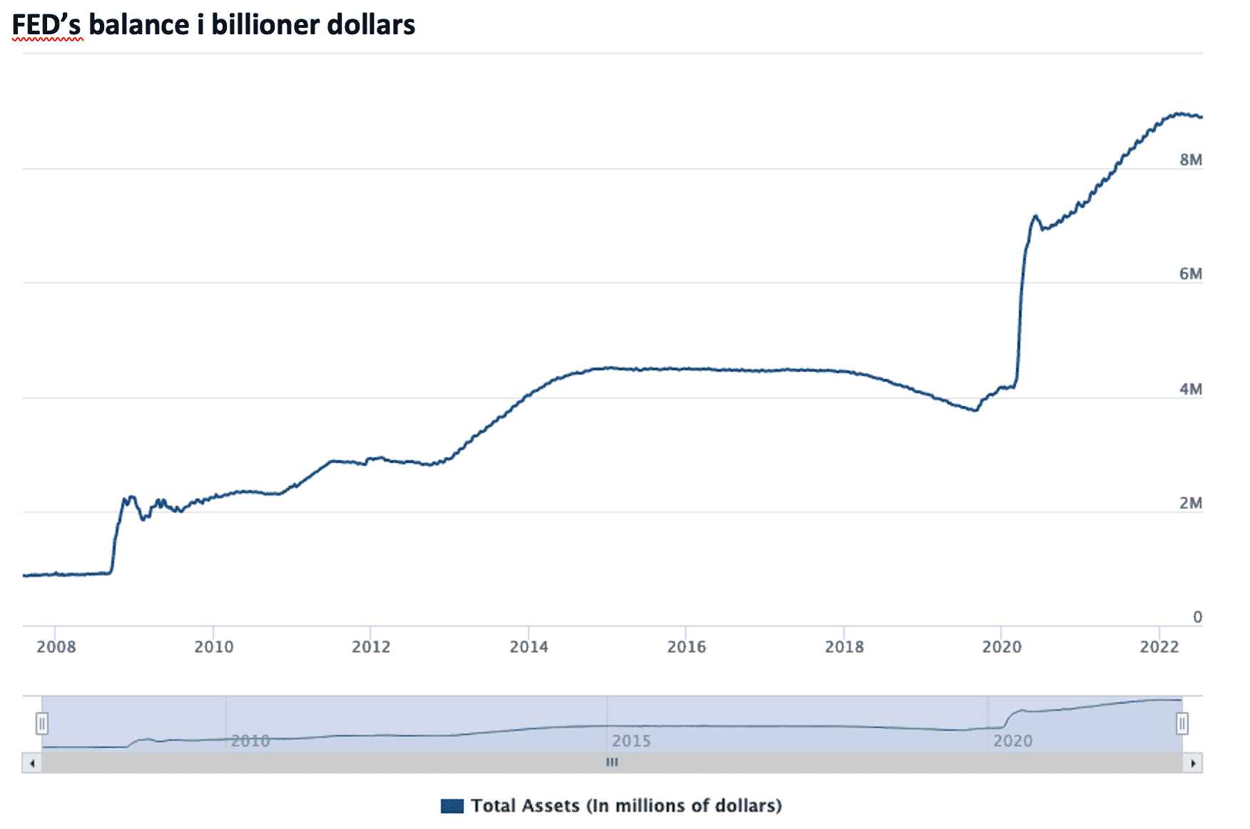 Figuren nedenfor viser, at den amerikanske centralbank har mere end fordoblet sin beholdning af obligationer (hovedsageligt stats- og realkreditobligationer som pt. udgør henholdsvis 5,7 og 2,7 billioner dollars – ca. 61.000 milliarder kroner) siden 2020: