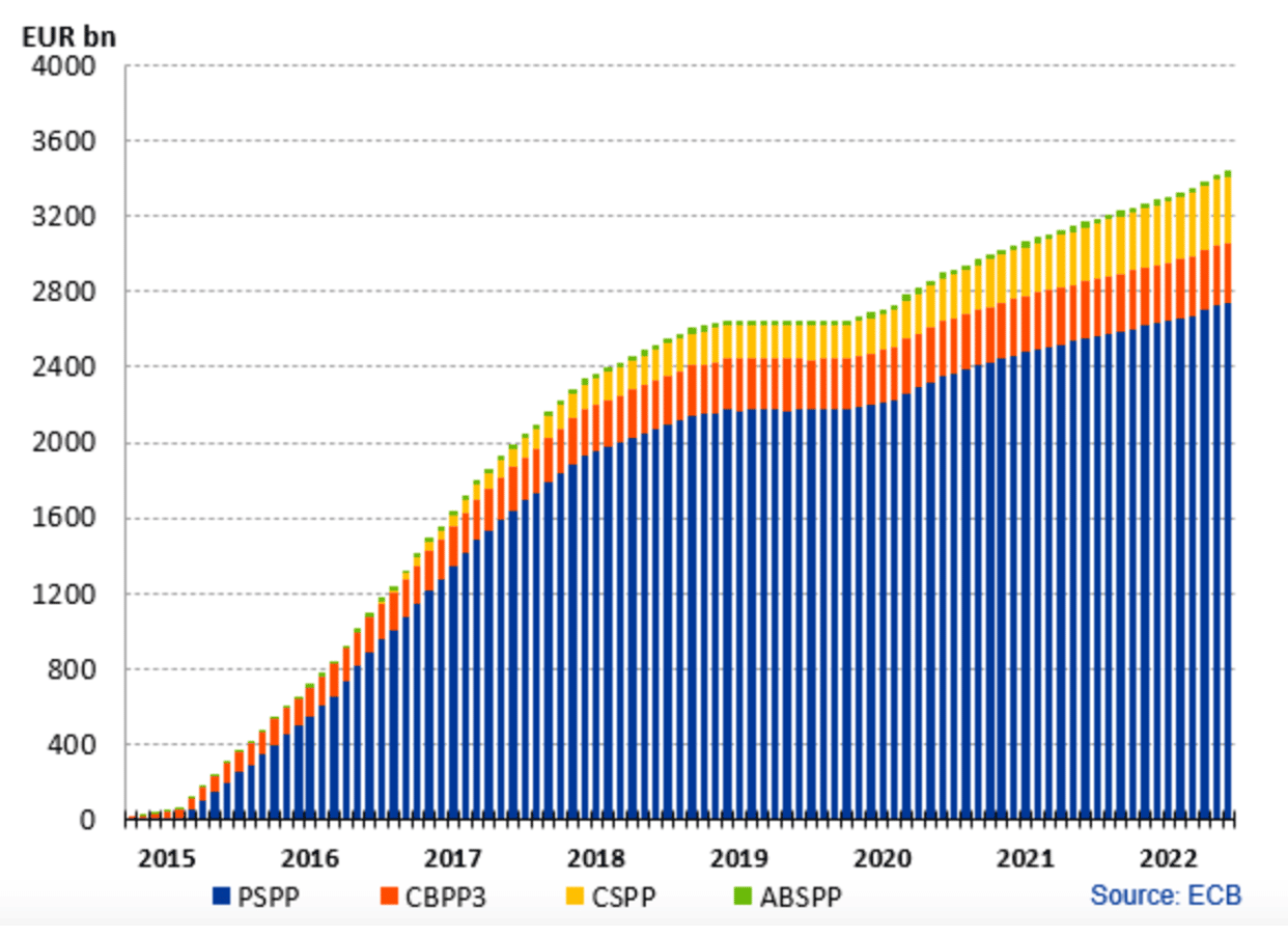 Kilde: https://www.ecb.europa.eu/mopo/implement/app/html/index.en.html, PSPP er offentligt udstedte obligationer, ABSPP er realkredit, og CSPP er erhvervsobligationer