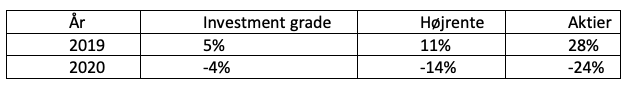 Tabel 1. Afkast på obligationer (sikre og højrente) og aktier i 2019 og 2020 pr. 31/3-2020.