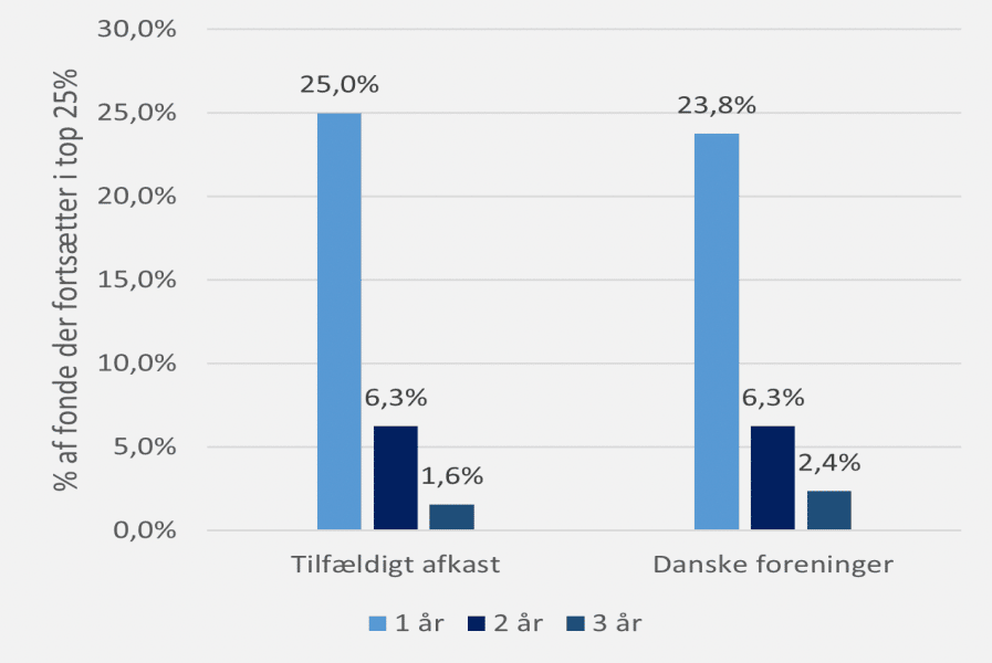 Hvert år udpeger vi de Top-25% bedste fonde. Herefter undersøges om disse fonde forbliver i top-25% i de følgende år. Hvis det er tilfældigt, vil man forvente at godt 6% af samtlige fonde befinder sig i top-25% to år i træk (svarende til 25% af 25%). Det kan du se i søjlerne til venstre i figuren. Hvis fonde med topresultater derimod år efter år ligger i top, vil søjlernes højde kun langsomt aftage i år to og år tre.