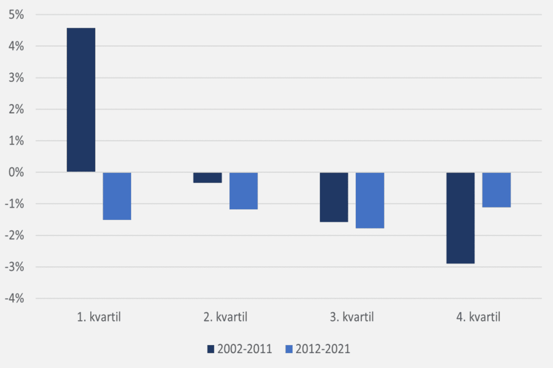 I figuren ser vi på alle aktiefonde med tyve års historik. I de mørkeblå søjler ser du afkastet i forhold til markedet i den første halvdel af perioden (2002-2011), hvor vi igen har rangeret dem i bedste fjerdedel (1. kvartal), næstbedste fjerdedel (2. kvartil) osv.
