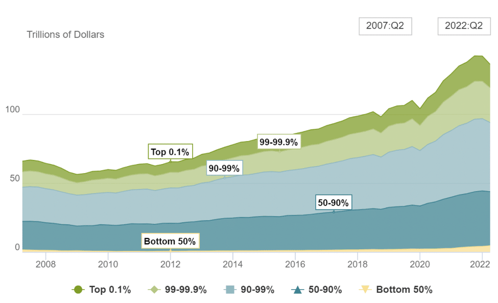 Figuren viser udviklingen i de amerikanske husholdningers samlede værdier de seneste femten år. Du kan se hvor meget de forskellige grupper udgør af totalen, rangeret efter formuestørrelse. Stigningen fra pandemien i 2020 og to år frem på hele 37% er iøjnefaldende. Det er den klart største stigning vi har oplevet, siden den amerikanske centralbank begyndte at måle på denne størrelse i 1989.