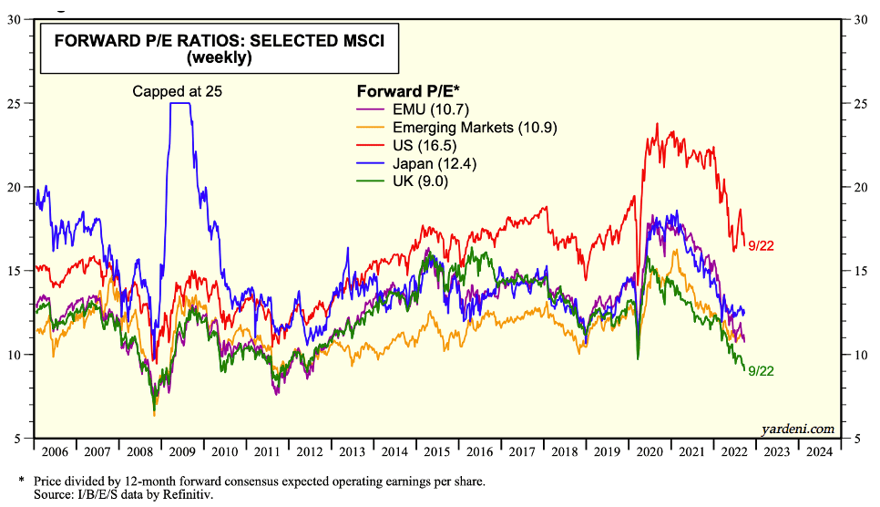 Hvor ligger vi så i dag? På alle andre markedet end USA er aktier nu faldet til et niveau, som vi så i kølvandet på finanskrisen. Europa (EMU+UK) har en P/E på ca. 10, hvilket er markant under det historiske gennemsnit på omtrent 15. Samme gælder Nye Markeder.