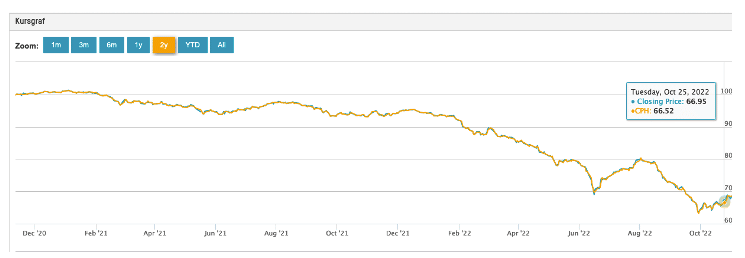 Fra toppunktet i 2021 til bunden i 2022 er kursen faldet 38 procent. På en obligation der ellers regnes som sikker og er forsynet med højeste rating af kreditvurderingsbureauerne på grund af den meget lille risiko for, at låntagerne går konkurs og ikke betaler.