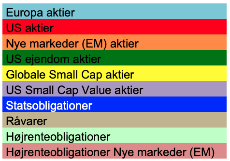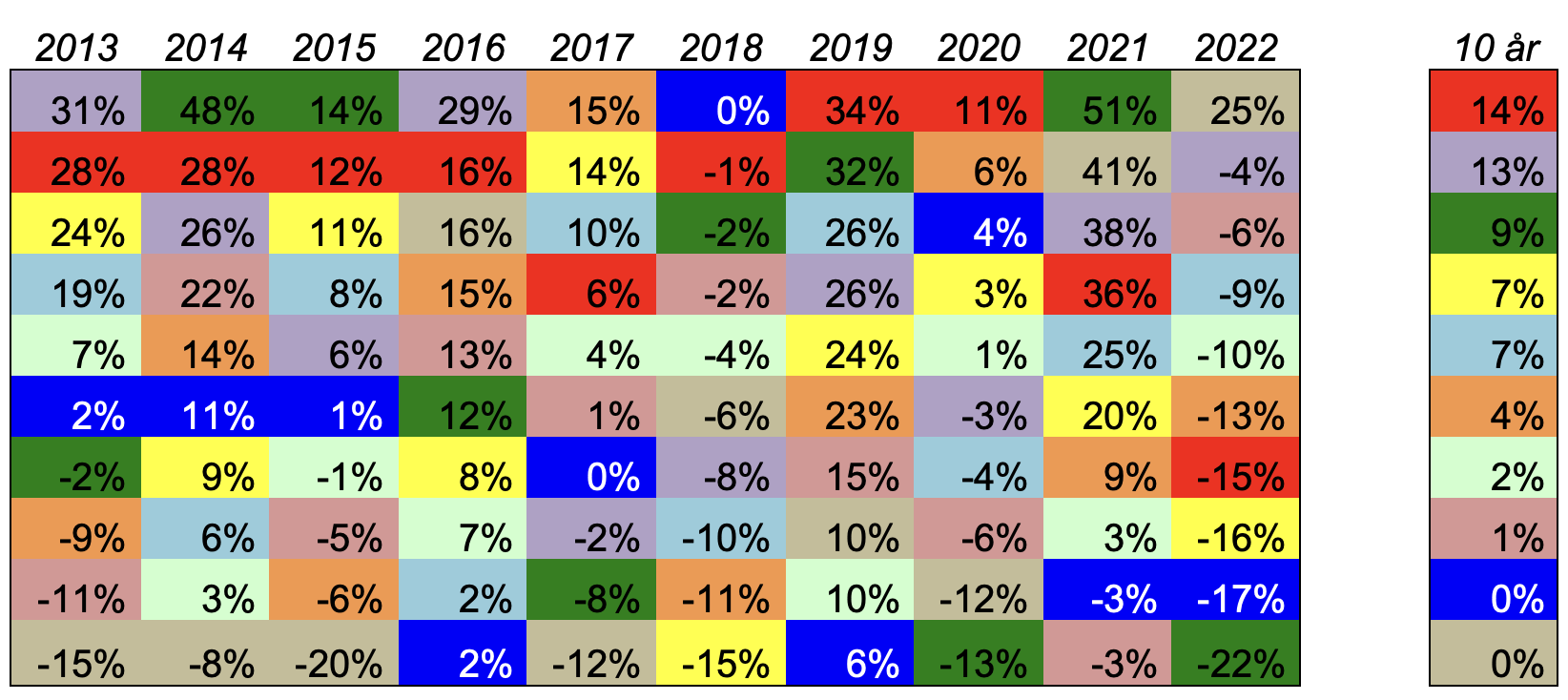 Bemærk farvekoderne som vi bruger til afkodning af ”kludetæppet af afkast” de seneste ti år: