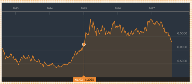 Lad os først se på udviklingen i US dollar i forhold til danske kroner de seneste fem år:
