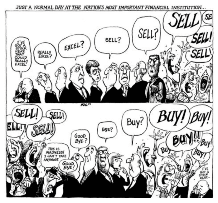 Det er vores tilbøjelighed til at tage hyppige mellemtider på aktiemarkedet, der giver næring til frygt-centeret i hjernen, selv om alt er som det skal være. Det er ganske nyttigt at vide. Og man kan le lidt af andre og sig selv, når man ser følgende illustration af markedets dynamik og uransageligheder (fra The Economist):